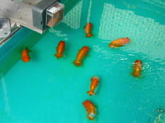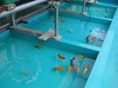 東側(左側)の大池にいた3池22尾を、昨朝西側(右側)の池に引越し・・・ 3日ねかせた更水に、古水を洗面器3杯割って、0.5%原塩投入、300Wヒーター15℃設定にて、2010年度のシーズンインと相成りました。