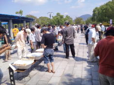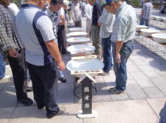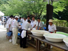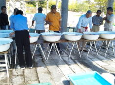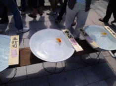 そして、洗面器に入賞魚が並び始めると、どっと人垣ができます。 |